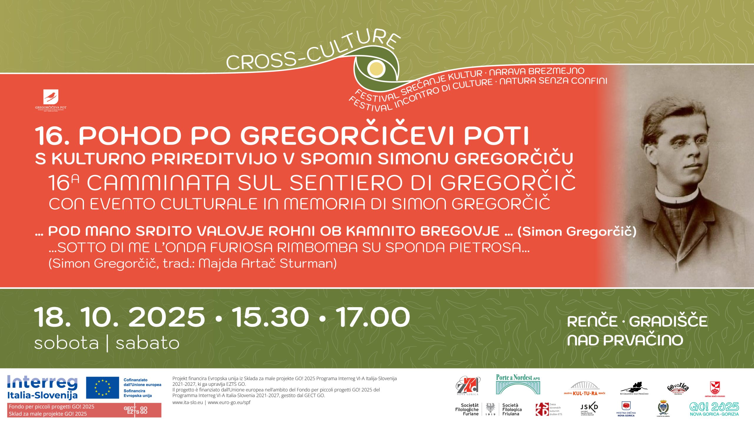 Kulturna dvorana na Gradišču Gradišče nad Prvačino16. POHOD PO GREGORČIČEVI POTI S KULTURNO PRIREDITVIJO V SPOMIN SIMONU GREGORČIČU 16 CAMMINATA SUL SENTIERO DI GREGORČIČ CON EVENTO CULTURALE IN MEMORIA DI SIMON GREGORČIČ … POD MANO SRDITO VALOVJE ROHNI OB KAMNITO BREGOVJE … (Simon Gregorčič) …SOTTO DI ME L’ONDA FURIOSA RIMBOMBA SU SPONDA PIETROSA… (Simon Gregorčič, trad.: Majda Artač Sturman) 15.15–15.30 ∙ […]